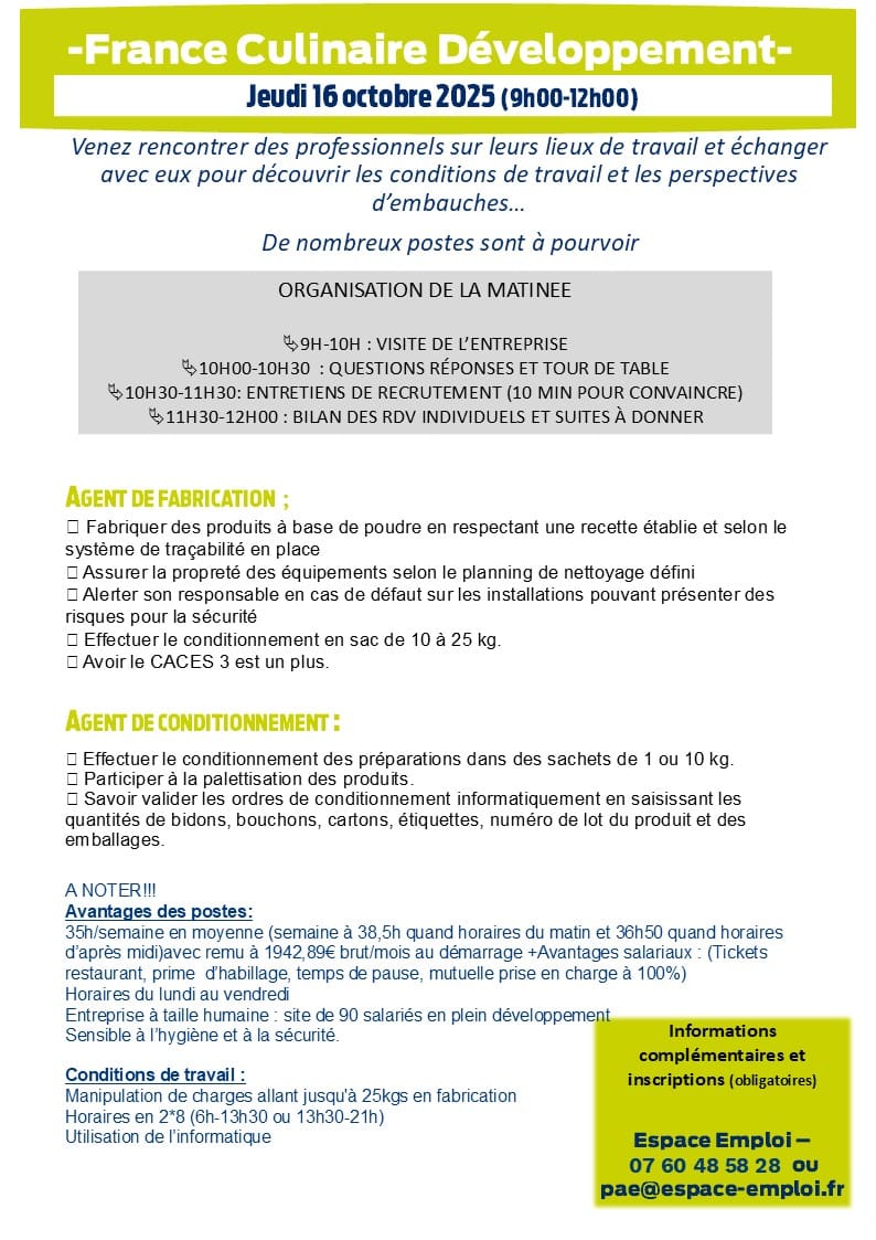 editeur2025-10-07T18:33:30+02:00Vous êtes à la recherche d'opportunités professionnelles ? Ne passez pas à côté de notre job dating organisé dans les locaux de France Culinaire Développement à Saint Gilles qui se déroulera le jeudi 16 octobre de 9h à 12h. Cette entreprise est spécialisée dans la fabrication et le conditionnement d'épices en gros. Plusieurs postes sont à [...]